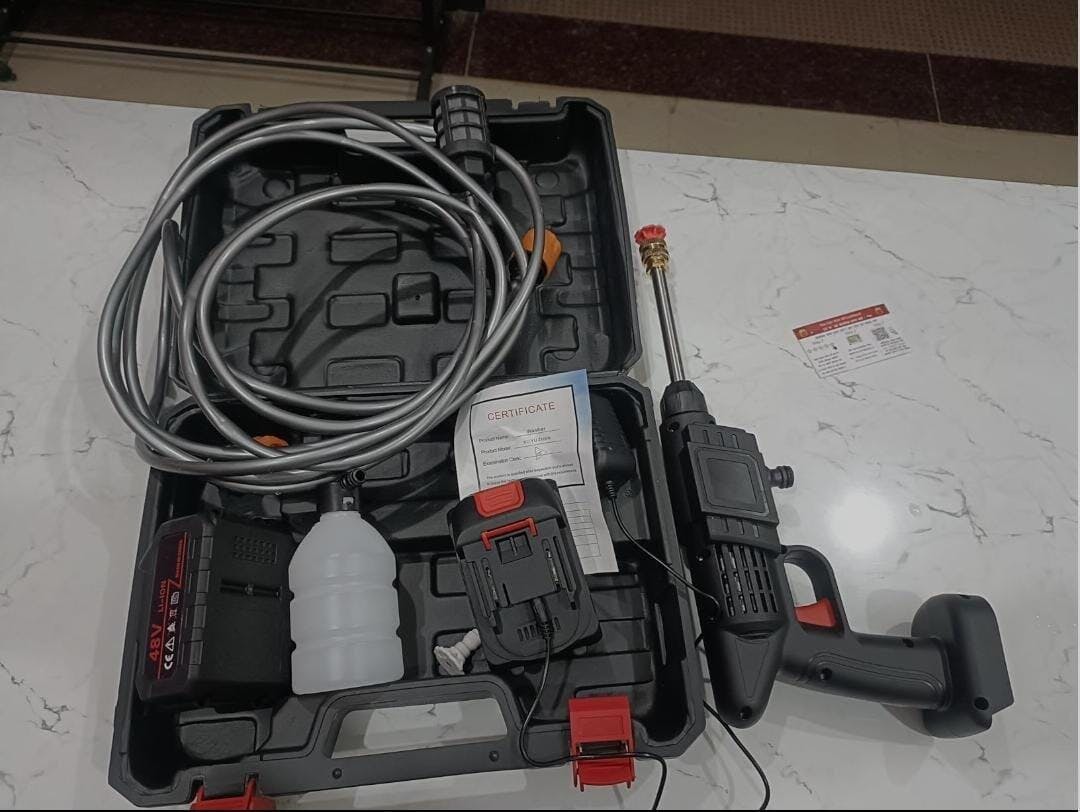 Box contents: 1 x portable pressure washer, 1 x 12 V battery pack, 1 x AC charger, 1 x 5 m filter hose, 1 x multifunctional head, 1 x foam pan.